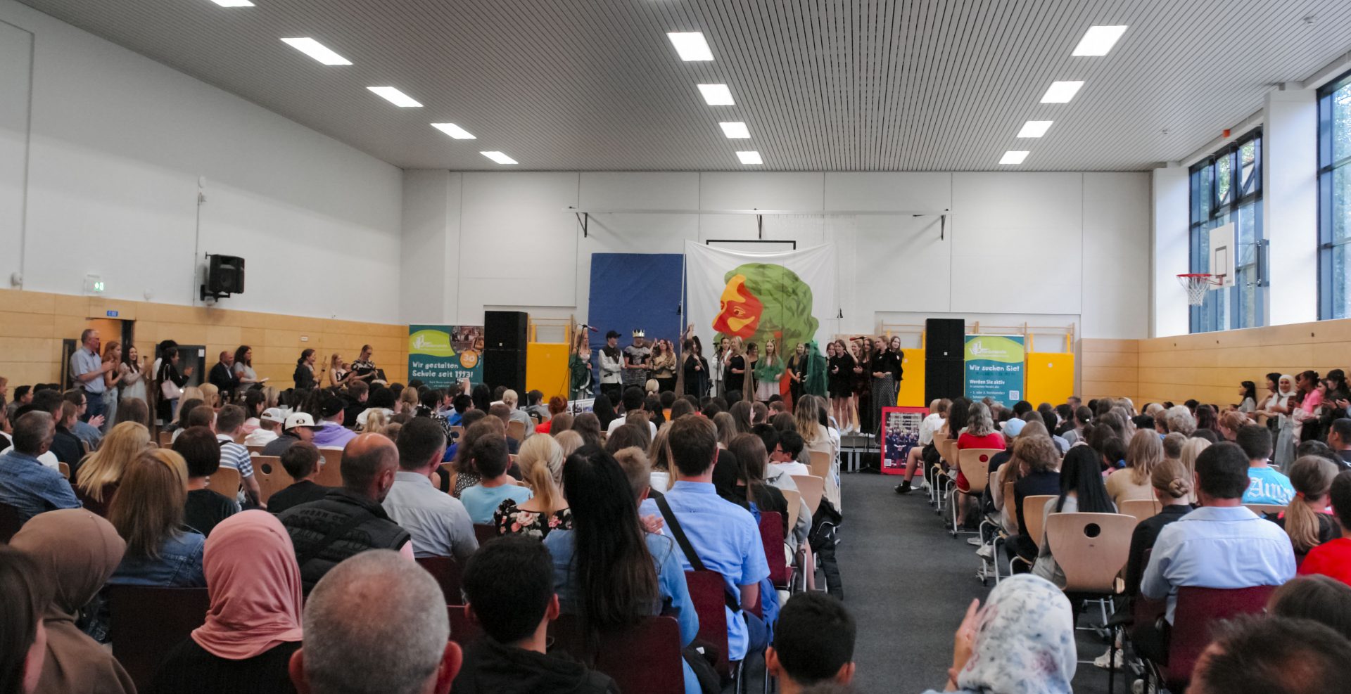 Am 27.06.2023 fand am Tagore-Gymnasium in der C-Turnhalle die Einschulung der neuen 7. Klassen statt. Zu Beginn führte der Schulchor eine Nummer vor, bei der zwei sehr talentierte Schülerinnen mehrere Lieder gesungen haben. Die Hintergrundmusik wurde von ebenfalls sehr talentierten Schülern mit verschiedenen Instrumenten gespielt. Danach wurde eine Rede der Schulleiterin von den zwei Moderatoren der Veranstaltung angekündigt.