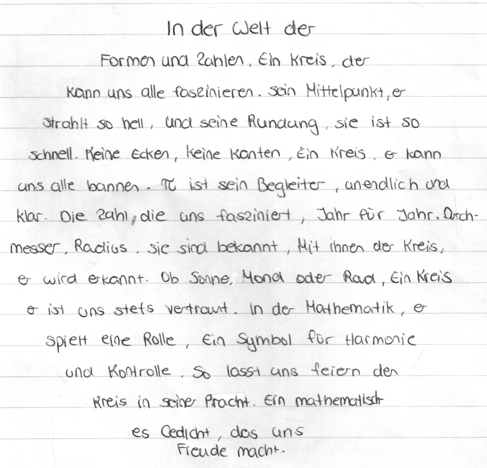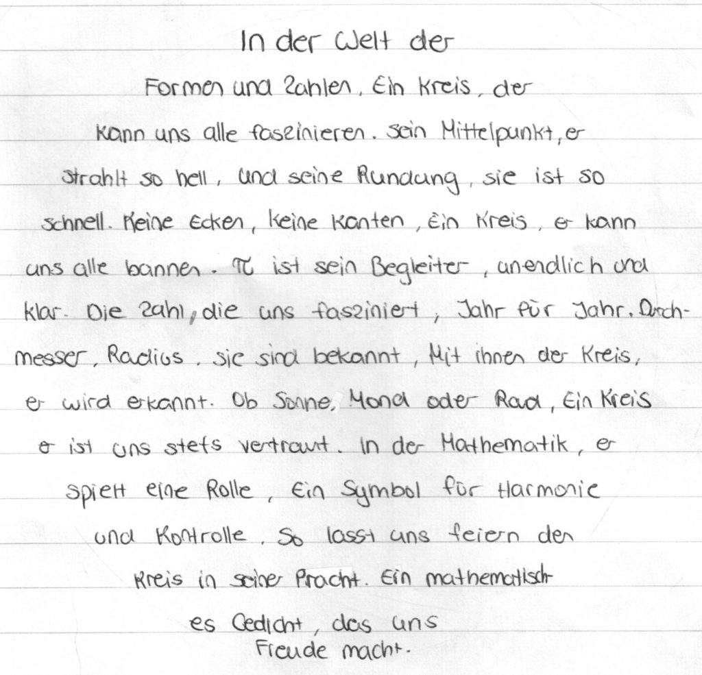 Nachdem die Jugendlichen einige Gedichte kennenlernten, verfassten sie selber Gedichte mit mathematischem Inhalt. So entstanden Verse und Strophen über die pq-Formel, die Unendlichkeit, die Berechnung quadratischer Gleichungen, das rätselhafte Galoppieren weißer Schimmel (Achtung, Tautologie!) und die Schönheit des Kreises. Letzteres sei hier samt schülereigner Erläuterung gezeigt: