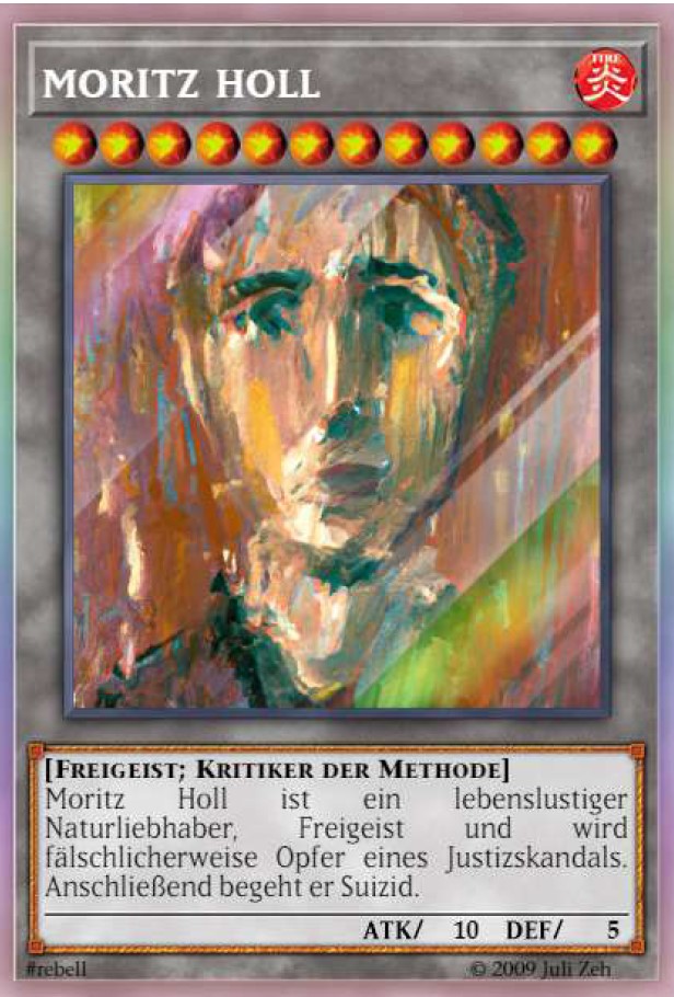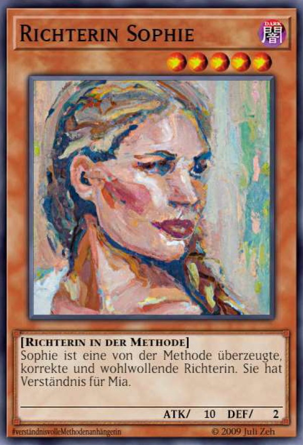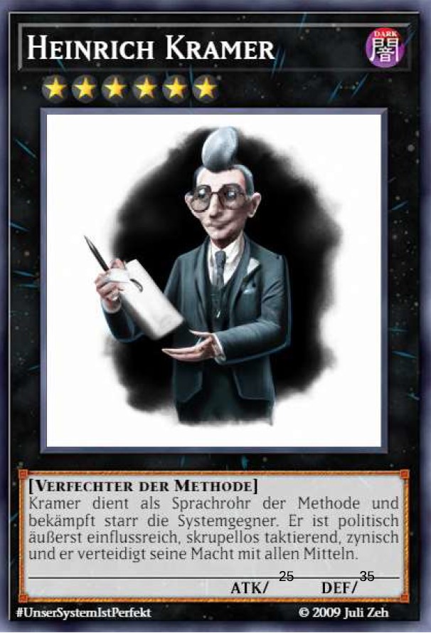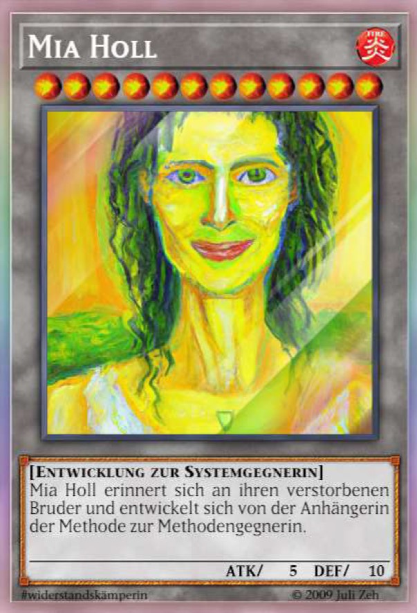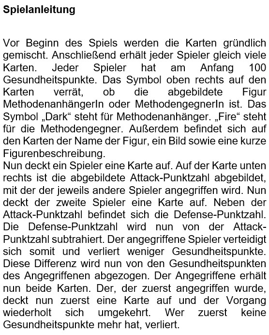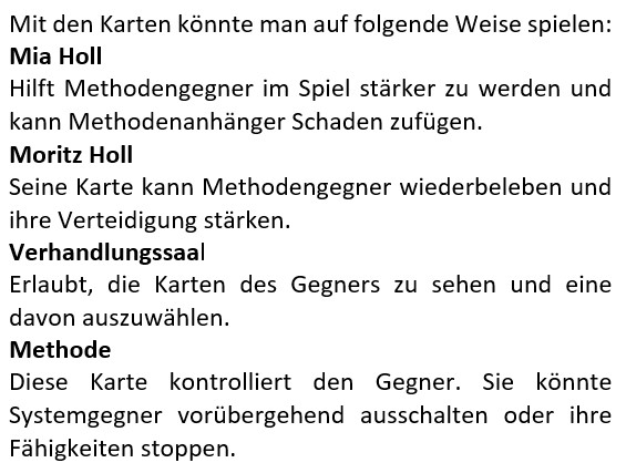 Die beiden Deutsch-Leistungskurse des 12. Jahrgangs von Frau Berthel haben im Rahmen der Beschäftigung mit Juli Zehs Roman CORPUS DELICTI einen interpretatorischen Zugang über Yu-gi-oh-Karten gefunden. Yu-gi-oh ist ein beliebtes Kartenspiel, das auf dem gleichnamigen Manga und Anime beruht und bei dem sich zwei Spieler duellieren. Die Schüler:innen der Leistungskurse Deutsch verarbeiteten ihr Wissen um Themen und Figuren des literarischen Textes, indem sie – angelehnt an die Yugioh-Karten – eine eigene Spielidee entwickelten.